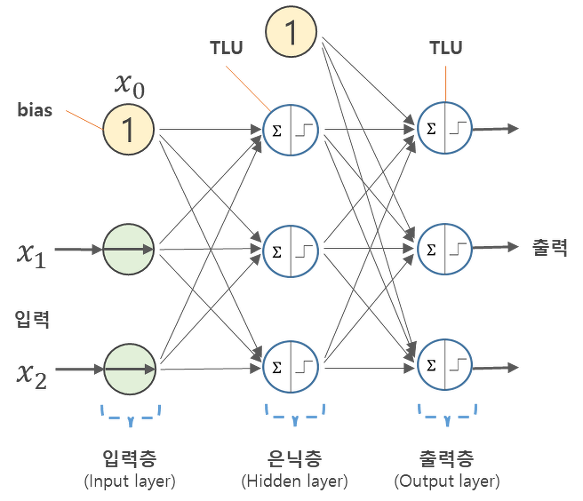 - 각 뉴런에서의 연산값이 정해진 임계값(TLU; Threshold Logic Unit)을 넘을 경우에만 다음 노드들이 있는 층(layer)으로 신호를 전달
