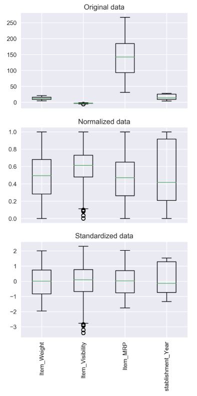 from sklearn.preprocessing import StandardScaler scaler=StandardScaler() scaler.fit(df) df_scaled=scaler.transform(df) #or scaler.fit_transform(df)데이터 원본, 정규화, 표준화된 데이터셋을 비교하자면 아래와 같다.